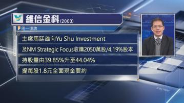 【Now財經台】維信金科(02003)今早(23日)復牌,主席馬廷雄因增持而觸發技術性全購,收購價每股1.8元,較停牌前有約9%折讓,係咪反映大股東唔想私有化公司?公司近年業績轉差,主席仍繼續增持,係咪佢睇好公司經營前景會好轉?