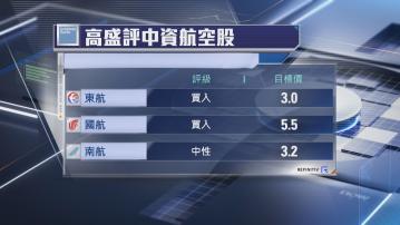高盛又稱,對東航看法正面,集團在上海及北京的市佔率分別為38%和48%,在往來中國與日本,以及中國與南韓等盈利較高航線具有優勢,維持東航「買入」評級,目標價3元,國航亦是「買入」評級,中國南方航空(01055)評級則為「中性」。