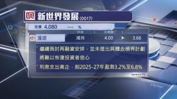 滙證指,投資者持續關注新世界債務問題,即使集團自2024年7月以來,已成功為178億元銀行貸款進行再融資,踏入2025年,集團再為2026年到期的580億元無抵押貸款尋求再融資。