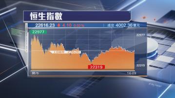 恒指高開134點,早段升幅曾擴大至356點,高見22977點,見逾4個月高位,在大型科技股獲利回套下,午後反覆。內地市倒升帶動,恒指尾市跌幅收窄,收市微跌4點,報22616點,成交增至4002億元,見逾4個月以來最多,北水淨流入108億。