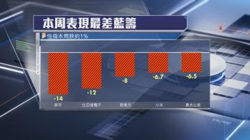 本周表現最差藍籌,依次為舜宇光學科技(02382)跌14%、比亞迪電子(00285)跌12%、新東方(09901)跌8%、小米集團(01810)跌6.7%、農夫山泉(09633)跌6.5%。