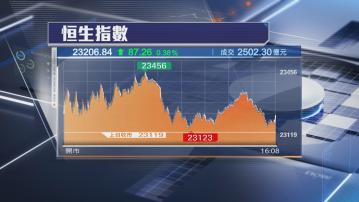 恒指高開97點,早段最多升過337點,高見23456點,但午後升幅顯著收窄,收市升87點,報23206點,大市成交減至2502億元,北水淨流入大增至198億元,是接近3星期以來最多。