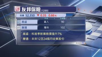 【Now財經台】高盛及摩根大通均認為,在環球不明朗的因素下,友邦保險(01299)仍具吸引力。