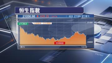 大市今日(16日)低開149點後,跌幅逐步擴大,午後最多跌近600點,低見20868點,尾市跌幅收窄,收市跌409點,報21056點。大市全日成交增至逾2199億元。