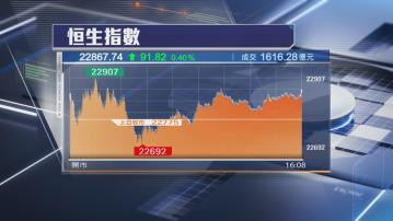大市今日(8日)高開80點,早段一度升131點,其後反覆向上,收市升91點,報22867點。大市全日成交縮減至逾1616億元。