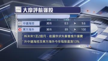 該行預期,隨著中美緊張的貿易關係緩和,未來1至2個月,美國補庫存帶來的航運需求將會急增,而供求失衡短期將推高運費,因此,上調中遠海控及東方海外今年每股盈利預測13%,明年則上調10%以上,不過,由於未來12至24個月仍有供應過剩風險,維持兩隻股份「減持」評級。