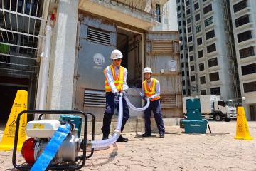 演練進一步模擬杏花邨遇上海水倒灌情況,令變電站的水浸情況加劇,影響電力供應。控制中心收到水浸警報後,即時調派工程人員、調配流動指揮中心前赴現場,開展緊急修復和復電工作;派出流動發電車和流動電池儲能車到場,一旦變電站內設施無法在短時間內重啟,也可以為居民提供臨時電力供應,盡力減低水浸對居民供電的影響。