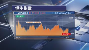 大市今日(6日)高開34點後,早段走勢反覆,其後逐步向下,尾市跌幅略為擴大,最多跌133點,收市跌114點,報23792點。大市全日成交增至逾2356億元。