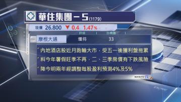 摩通又稱,部分投資者或因酒店業即將進入暑假旺季,部署內地酒店股,不過,經該行評估第2、第3季內地酒店房間預訂情況後,估計平均房價有下跌風險,因此,下調相關股份每股盈利預測,當中包括華住酒店(01179)H股,下調今明兩年每股盈測4至5%,但未有調整目標價及評級。