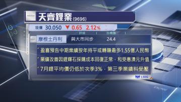 另一隻鋰業股天齊則發盈喜,估計中期將扭虧為盈,賺最多1.55億元人民幣,去年同期則蝕52億元人民幣,大摩指,公司首季賺約1億元人民幣,推算第2季賺5100萬至蝕約1億元人民幣,同樣受鋰供過於求影響,雖然天齊在成本方面具優勢,但第3季業績仍有壓力,維持「與大市同步」評級,目標價24.4元。