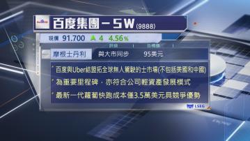 【Now財經台】摩根士丹利認為,百度(09888)跟Uber合作擴展海外無人駕駛業務,是一個重要發展里程碑。