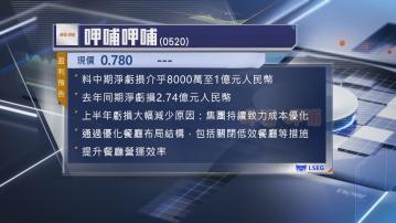 集團估計,截至6月底止中期,淨虧損將介乎8000萬至1億元人民幣,去年同期則蝕2.74億元人民,即上半年虧損大幅收窄逾63%至逾70%,主要是公司持續致力成本優化,以及透過優化餐廳布局結構,包括關閉低效餐廳等,提升餐廳營運效率。