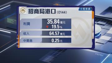 【Now財經台】招商局港口(00144)中期少賺近20%至逾35億元,按年跌19.5%,期內,收入64.5億元,按年增長逾11%,派中期息0.25元。