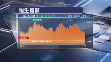 大市今日(29日)高開96點後,早段最多升278點,其後升幅收窄,收市升78點,報25077點。大市全日成交縮減至逾3356億元。