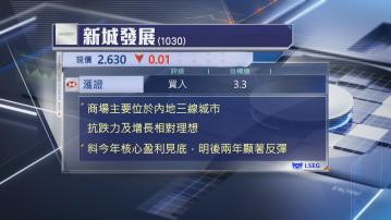該行指,雖然新城發展是民企內房,亦被視為風險較高的內地商場營運商,但仍看好集團前景。滙證續指,新城發展是近期首家成功發行離岸美元債的內房,加上旗下逾100個商場中,有逾70%位於三線城市,大眾化市場明顯抗跌力較強,亦錄得自然增長,去年及今年上半年同店銷售表現較全國整體零售商理想。