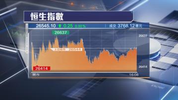 恒生指數今日(19日)高開38點後,早段缺乏方向,最多升92點,高見26637點,其後走勢反覆,最多跌130點,收市升不足1點,報26545點。大市全日成交縮減至逾3768億元。